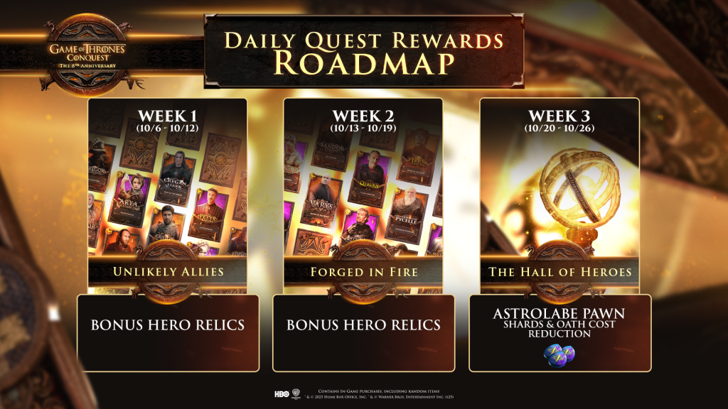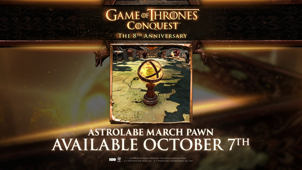 The Astrolabe has long recorded the great stories of Westeros’ heroes. Now, its legacy is yours to carry on the battlefield. On October 7th, check your in-game mailbox to claim enough pawn shards to unlock the Astrolabe March Pawn for free!