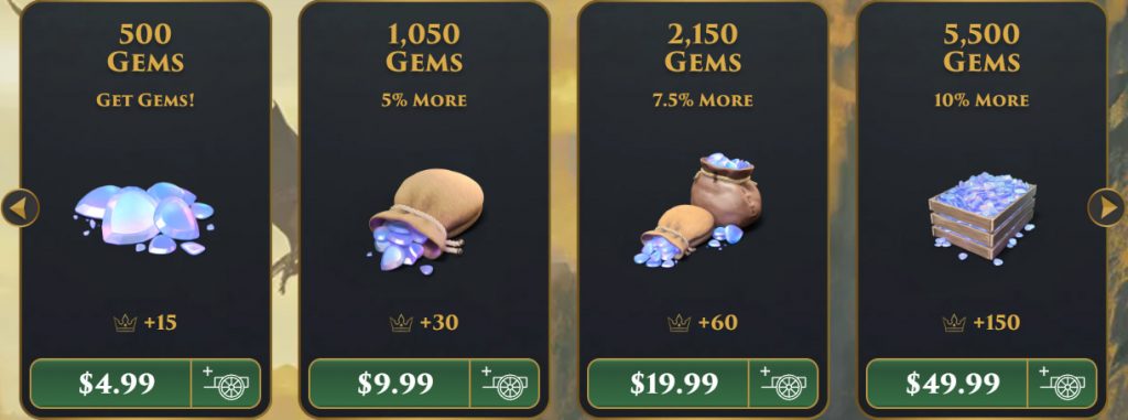 Note: You can only purchase one Gem pack per transaction. We have included higher designations of Gems in the Web Store to cut down on the need for multiple transactions, should players want to stock up. Additionally, larger packs carry larger discounts per Gem, for up to 20% more value in player’s purchases.