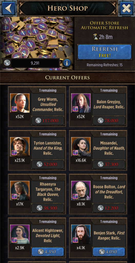 Make use of the Hero Shop to collect relics of Heroes you have yet to level up!